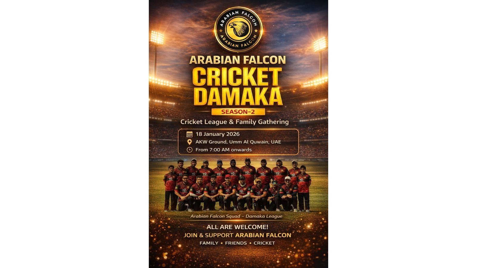 Umm Al Quwain: Cricket lovers are warmly invited to witness an exciting Cricket Dhamaka organized by Arabian Falcons, featuring expatriate players from Madai and Mattool Panchayats.