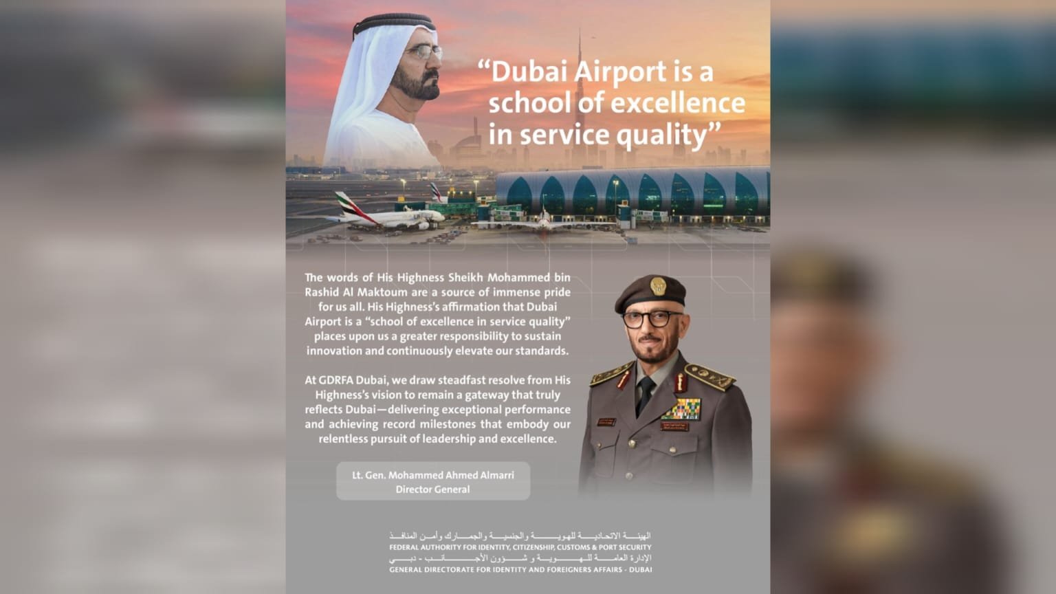 The statement by His Highness Sheikh Mohammed bin Rashid Al Maktoum describing Dubai International Airport as “a school of excellence in service” has been hailed as a proud moment by Lieutenant General Mohammed Ahmed Al Marri, Director General of GDRFA Dubai.
